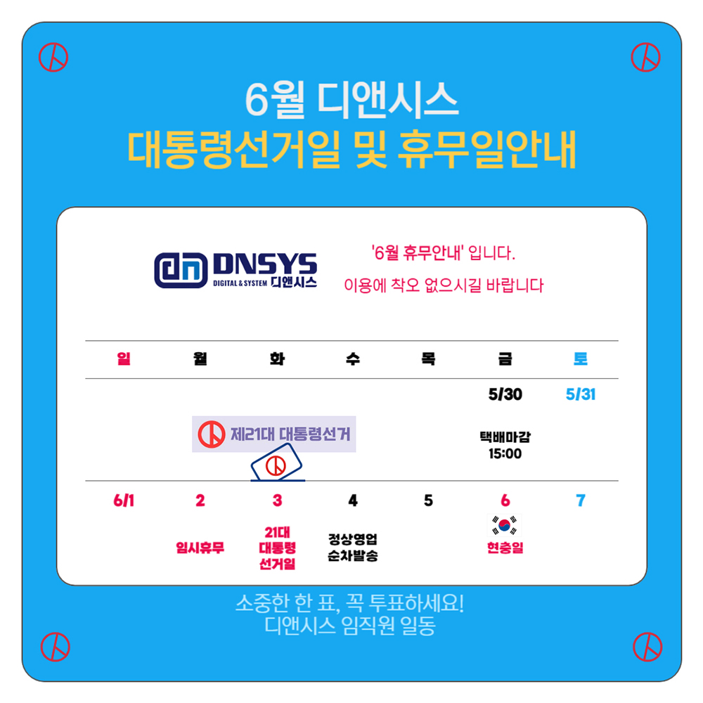 www.dnsys.co.kr휴무안내 #선거일휴무 #대선 #대통령선거 #휴무 #임시휴일 #징검다리휴무 #디앤시스 #dnsys