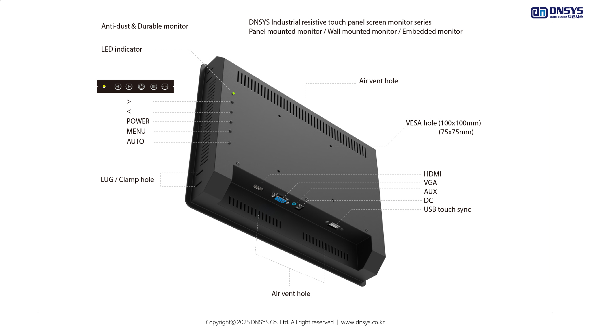 전면 방수 터치 모니터는 습도가 높거나 염분,분진 등의 환경에서 사용할 수 있는 모니터를 찾는 고객들을 위한 것입니다. 메탈 및 알루미늄 재질의 견고하고 Rugged한 디자인의 하우징으로 구성되어 있으며, 국제표준의 VESA 마운트 홀을 가지고 마운팅 하실 수 있습니다.