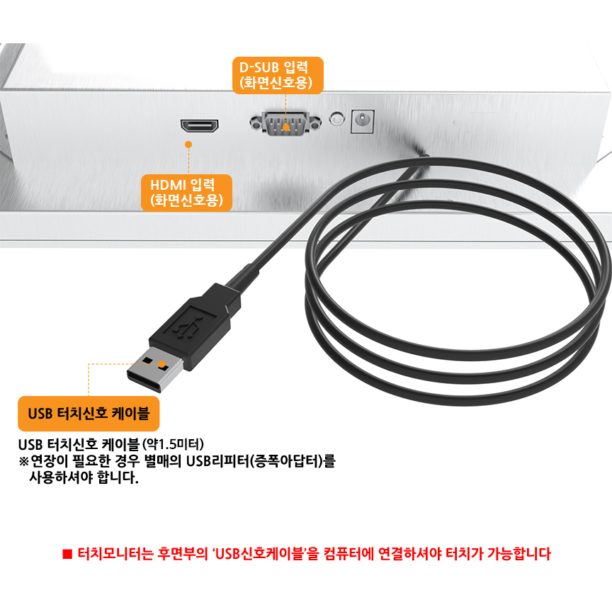 ※ 터치모니터는 터치신호 전달을 위해 동봉된 USB케이블을 반드시 컴퓨터(노트북)등에 연결하셔야 합니다.