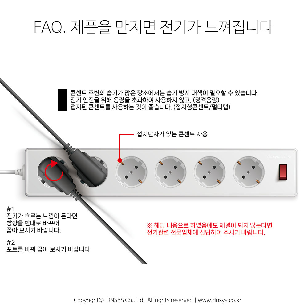 1. 전기가 흐르는 느낌이 든다면 콘센트 포트의 방향을 반대로 바꾸어 꼽아 보시기 바랍니다.