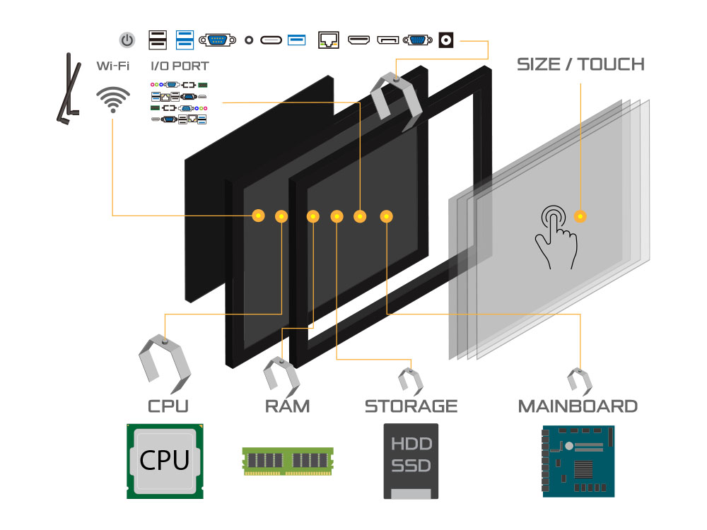 LCD Size / CPU / RAM / STORAGE[SSD/HDD] / Wi-Fi / LAN / COM port / Waterproof IP65 / etc