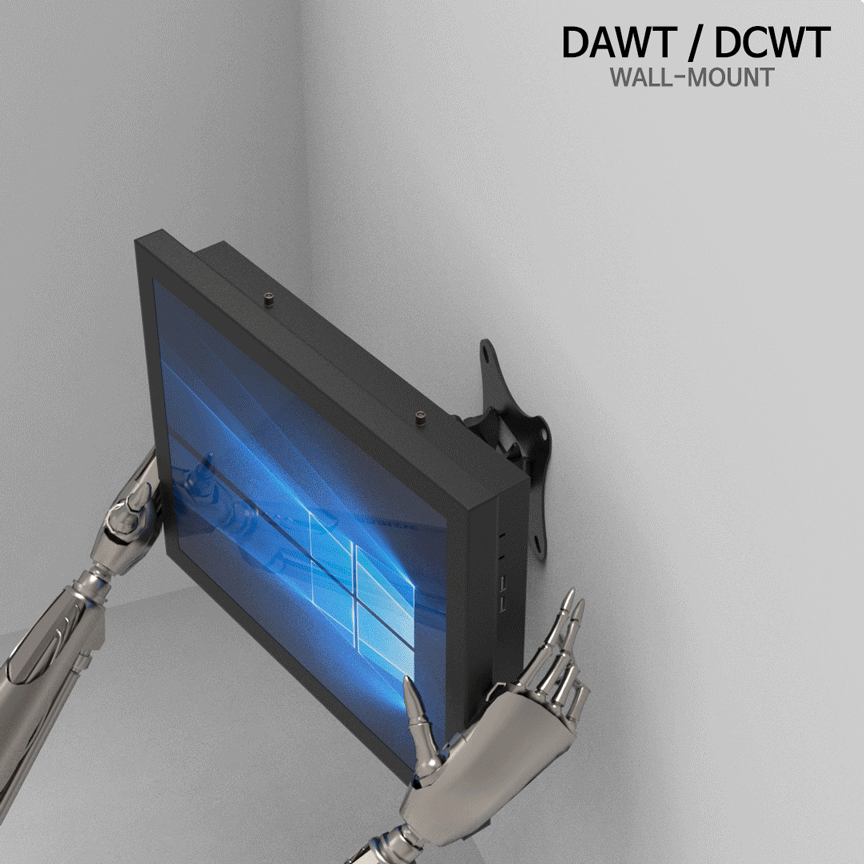월마운트 일체형 컴퓨터(Wall mount computer)는 컴퓨터 뒷부분 국제규격의 베사홀(VESA HOLE)을 이용하여 브래킷(Bracket)이나 거치대(Stand/Mount/Holder) 등을 고정, 벽걸이/매립 형태 등으로 활용할 수 있는 방식을 말합니다. 기구 뒷면에 100x100mm 와 75x75mm 규격의 홀을 선택적으로 이용하여 고정식 혹은 접이식 암브래킷(Arm Bracket/Mount/Holder/Clamp)을 활용하여 벽이나 장비 등에 마운팅 할 수 있습니다. 월마운트 타입(Wall Mount type)의 경우 기구 형태가 그대로 외부에 노출 되기에 디자인 및 색상, 로고, 도장 방식이 고객마다 다양하며 애플리케이션 별로 신규로 모델을 개발 , 디자인 되어야 하는 경우가 많습니다.