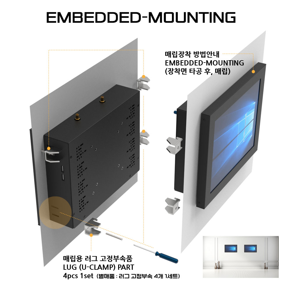 월마운트 일체형 컴퓨터(Wall mount computer)는 컴퓨터 뒷부분 국제규격의 베사홀(VESA HOLE)을 이용하여 브래킷(Bracket)이나 거치대(Stand/Mount/Holder) 등을 고정, 벽걸이/매립 형태 등으로 활용할 수 있는 방식을 말합니다. 기구 뒷면에 100x100mm 와 75x75mm 규격의 홀을 선택적으로 이용하여 고정식 혹은 접이식 암브래킷(Arm Bracket/Mount/Holder/Clamp)을 활용하여 벽이나 장비 등에 마운팅 할 수 있습니다. 월마운트 타입(Wall Mount type)의 경우 기구 형태가 그대로 외부에 노출 되기에 디자인 및 색상, 로고, 도장 방식이 고객마다 다양하며 애플리케이션 별로 신규로 모델을 개발 , 디자인 되어야 하는 경우가 많습니다.