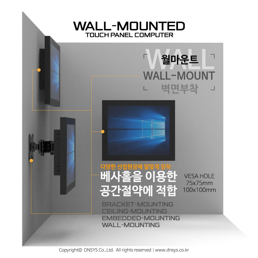 월마운트 일체형 컴퓨터(Wall mount computer)는 컴퓨터 뒷부분 국제규격의 베사홀(VESA HOLE)을 이용하여 브래킷(Bracket)이나 거치대(Stand/Mount/Holder) 등을 고정, 벽걸이/매립 형태 등으로 활용할 수 있는 방식을 말합니다. 기구 뒷면에 100x100mm 와 75x75mm 규격의 홀을 선택적으로 이용하여 고정식 혹은 접이식 암브래킷(Arm Bracket/Mount/Holder/Clamp)을 활용하여 벽이나 장비 등에 마운팅 할 수 있습니다. 월마운트 타입(Wall Mount type)의 경우 기구 형태가 그대로 외부에 노출 되기에 디자인 및 색상, 로고, 도장 방식이 고객마다 다양하며 애플리케이션 별로 신규로 모델을 개발 , 디자인 되어야 하는 경우가 많습니다.