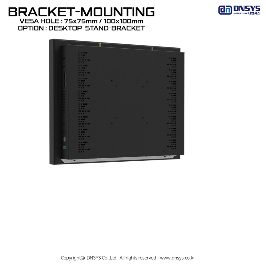 월마운트 일체형 컴퓨터(Wall mount computer)는 컴퓨터 뒷부분 국제규격의 베사홀(VESA HOLE)을 이용하여 브래킷(Bracket)이나 거치대(Stand/Mount/Holder) 등을 고정, 벽걸이/매립 형태 등으로 활용할 수 있는 방식을 말합니다. 기구 뒷면에 100x100mm 와 75x75mm 규격의 홀을 선택적으로 이용하여 고정식 혹은 접이식 암브래킷(Arm Bracket/Mount/Holder/Clamp)을 활용하여 벽이나 장비 등에 마운팅 할 수 있습니다. 월마운트 타입(Wall Mount type)의 경우 기구 형태가 그대로 외부에 노출 되기에 디자인 및 색상, 로고, 도장 방식이 고객마다 다양하며 애플리케이션 별로 신규로 모델을 개발 , 디자인 되어야 하는 경우가 많습니다.
