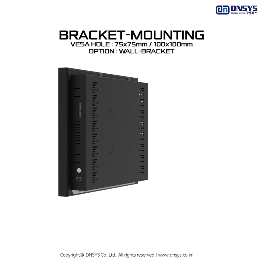 월마운트 무소음 팬리스 히트싱크 적용(하드랙[HDD/SSD RACK])옵션의 일체형 컴퓨터(Wall mount - Fanless heatsink computer)는 Anti-dust, Drable, Silent embedded system으로 산업현장의 가혹조건에서 먼지,유증기 등의 유입 방지 설계(방진기능)과 고효율 냉각 설계구조(팬리스 히트싱크)의 제품이며, 컴퓨터 후면부에 FANLESS HEATSINK 및 국제규격의 베사홀(VESA HOLE)을 적용하여 무소음 및 방진/방열성능을 극대화하여 안정적인 시스템 운용에 적합하며, 베사홀(VESA HOLE)을 통하여 별매 구성의 브래킷(Bracket)이나 거치대(Stand/Mount/Holder) 등을 고정, 벽걸이/매립 형태 등으로 활용할 수 있는 방식을 말합니다. 기구 뒷면에 100x100mm 와 75x75mm 규격의 홀을 선택적으로 이용하여 고정식 혹은 접이식 암브래킷(Arm Bracket/Mount/Holder/Clamp)을 활용하여 벽이나 장비 등에 장착 할 수 있습니다. 월마운트 타입(Wall Mount type)의 경우 기구 형태가 그대로 외부에 노출 되기에 디자인 및 색상, 로고, 도장 방식이 고객마다 다양하며 애플리케이션 별로 신규로 모델을 개발 , 디자인 되어야 하는 경우가 많습니다. 디앤시스는 이러한 시장의 다양한 요구, 사양, 단가, 기능에 맞추어 전용으로 개발 생산 가능하며 산업용 컴퓨터 분야의 오랜 경험과 기술을 바탕으로 신뢰성 및 안정성 높은 최고의 제품을 개발 생산 하여 드립니다.